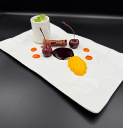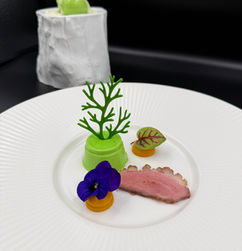 Schwarzkohlmeringues, geräuchte Jakobsmuschel, Kaviar